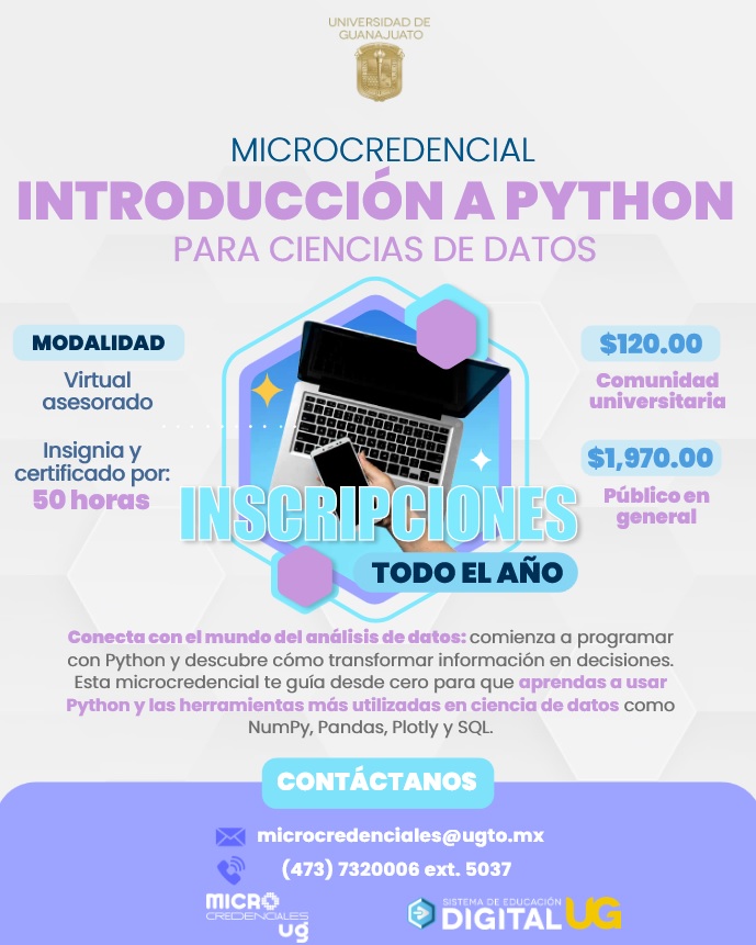 Para conocer más sobre la microcredencial UG “Introducción a Python para ciencia de datos”, ingresa a https://microcredenciales.ugto.mx/index.php/mcipcd/.